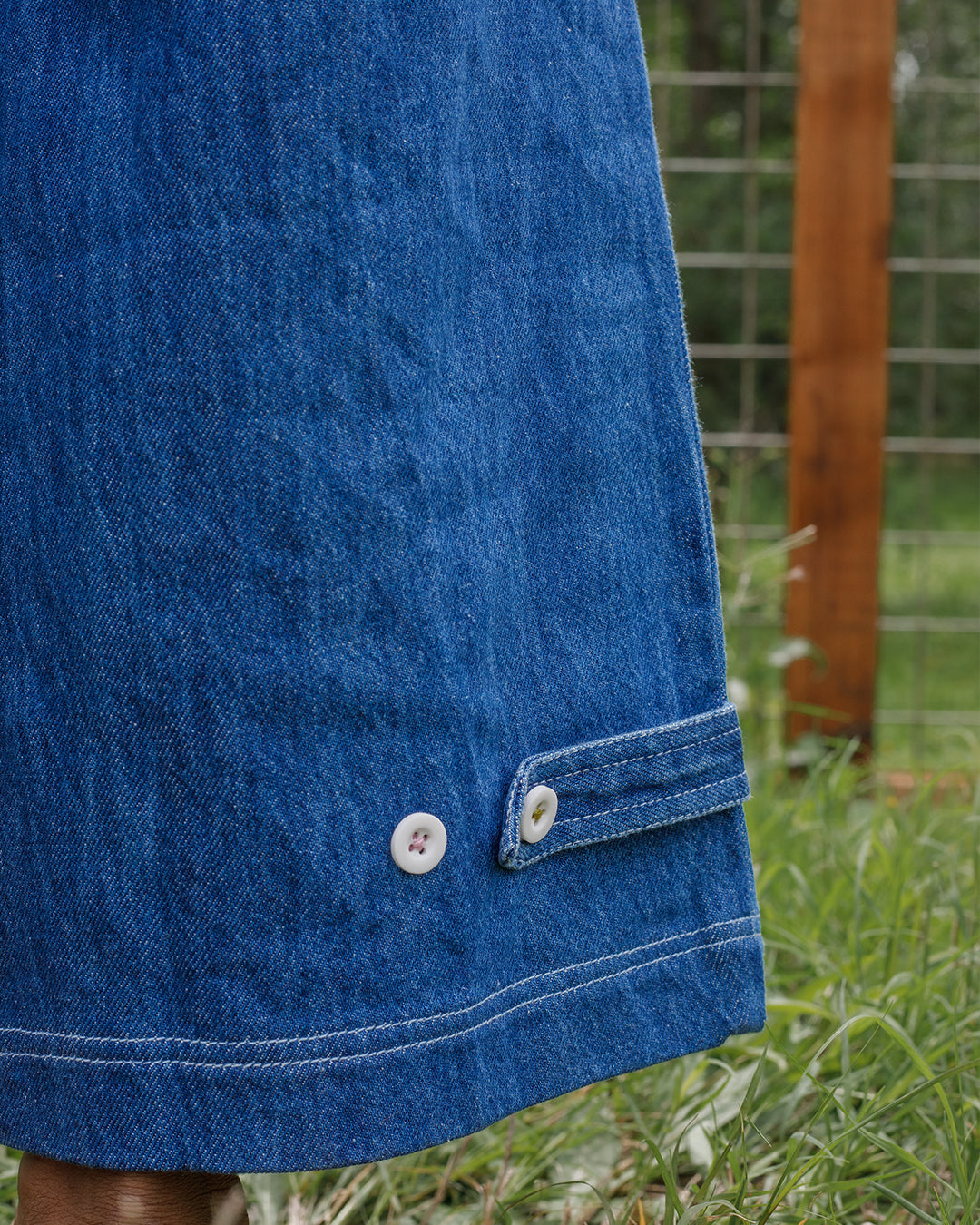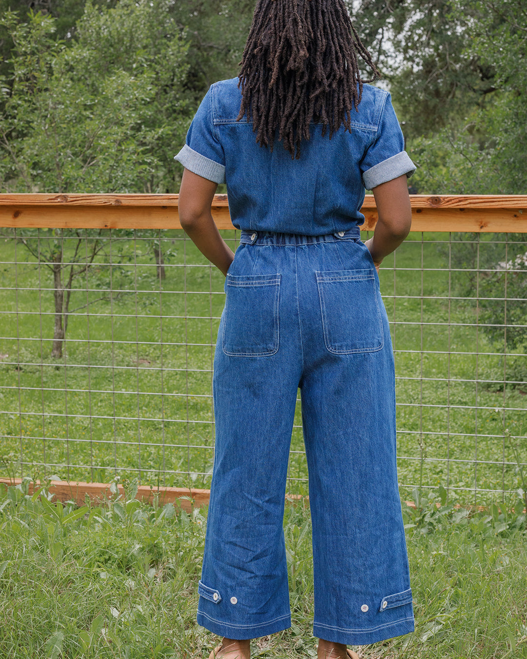 Designed with a flattering, slightly relaxed fit, it features a button-front bodice, patch pockets, and subtle contrast stitching with mixed thread colors for a touch of character. An adjustable back tab with elastic lets you cinch the waist just right, while button tabs at the hem allow you to customize the leg shape, from straight to slightly tapered.